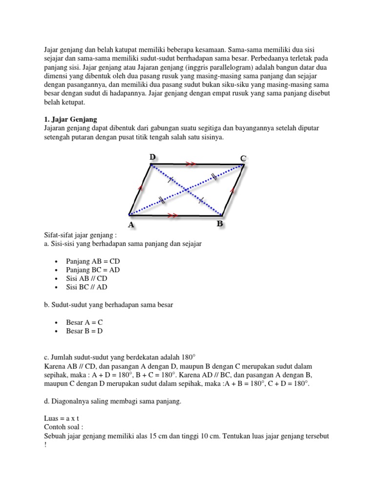 Jenis Sudut Jajargenjang : Mempunyai 2 diagonal dengan panjang yang berbeda.. Banyak jenis jajar genjang tetapi segitiga dibagi mencari sudut jajaran genjang. Sudut tumpul kalau gak salah. Pada jenis ini umumnya menggunakan kata ganti aku. Sudut tumpul dan sudut lancip #maaf klo salah. Dua sudut yang saling berhadapan besarnya sama.